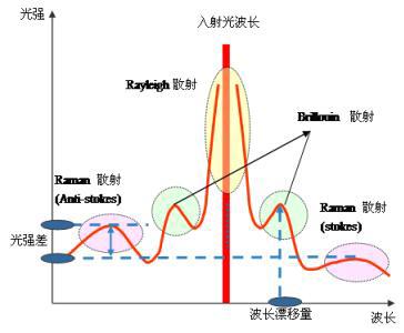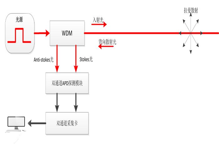 在光纤中,散射信号是连续的,通过使用高速信号采集技术,测量入射光和拉曼散射光之间的时间间隔,可以得到拉曼散射光发生的位置,由于拉曼散射光对温度敏感,所以可以沿着光纤测量到相应的温度分布。